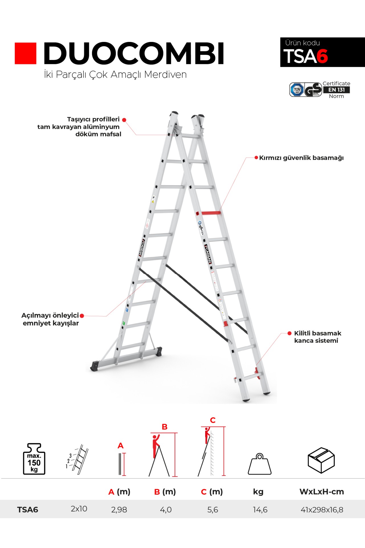 Çağsan DUOCOMBI merdivenlerin hafif yapısı, taşınmasının kolay olmasını sağlar ve çalışma alanlarında hareketlilik kazandırır. Aynı zamanda sağlamlığı ve yüksek taşıma kapasitesi sayesinde güvenlidir.