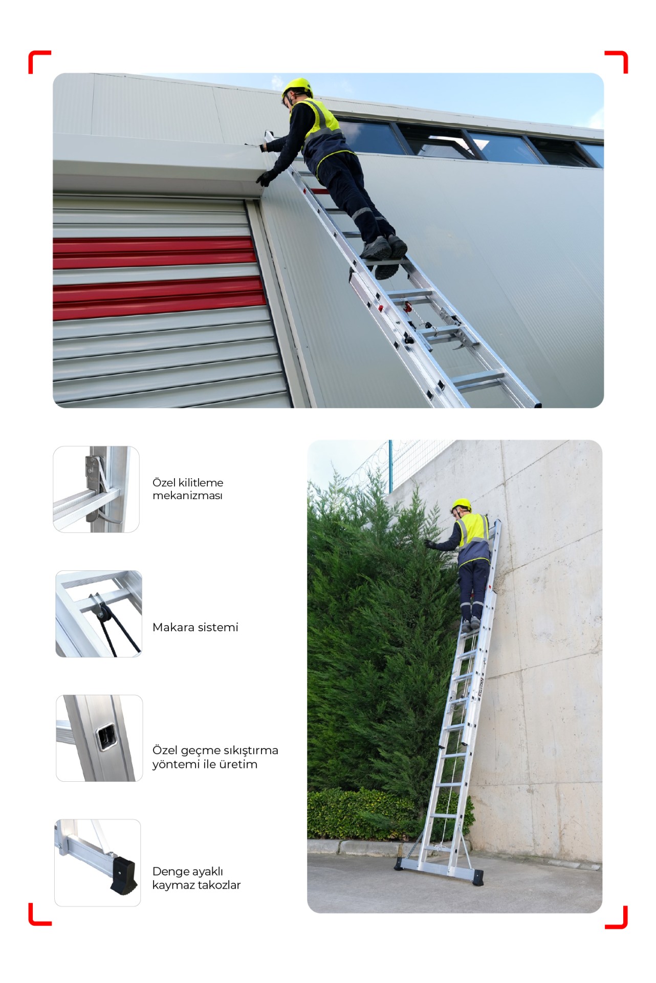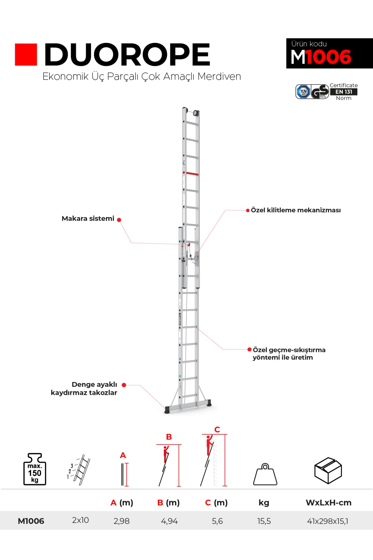 DUOROPE, TÜV-SÜD ve TSE EN 131 standardındaki kalite belgelerine sahip olmasıyla güvenilirliğini kanıtlar. Çeşitli iş alanlarında kullanılabilen bu merdiven, esneklik, taşınabilirlik ve güvenlik odaklı tasarımıyla çalışma verimliliğinizi artırırken güvenli bir kullanım deneyimi sunar.