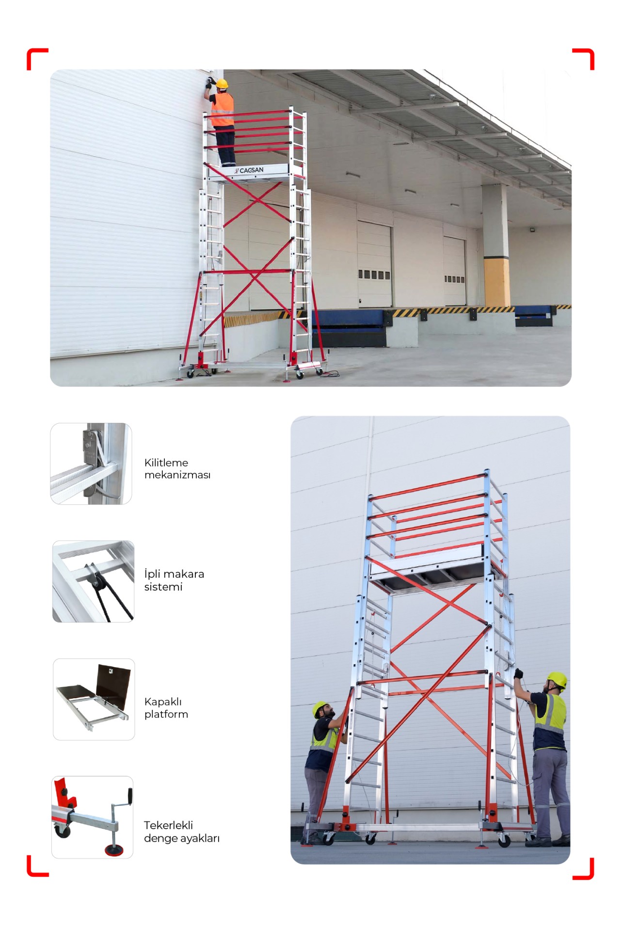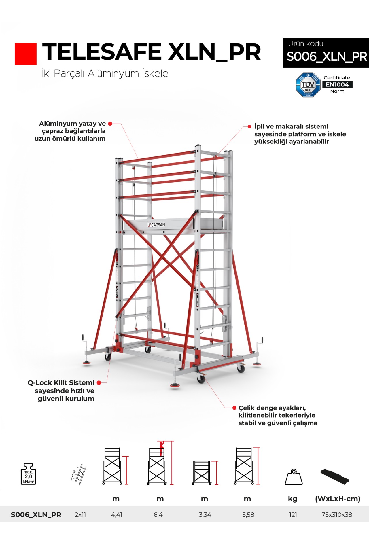 Q-Lock Kilit Sistemi sayesinde hızlı ve güvenli bir şekilde kurulum yapabilirsiniz. İpli ve makaralı sistemlerle platform ve iskele yükseklikleri her 28 cm'de bir ayarlanabilir. İçten açılan platform kapakları, personelin platforma güvenli bir şekilde ulaşmasını sağlar. 110 cm yüksekliğindeki korkuluklar, çalışanlara güvenli bir çalışma ortamı sunar.
