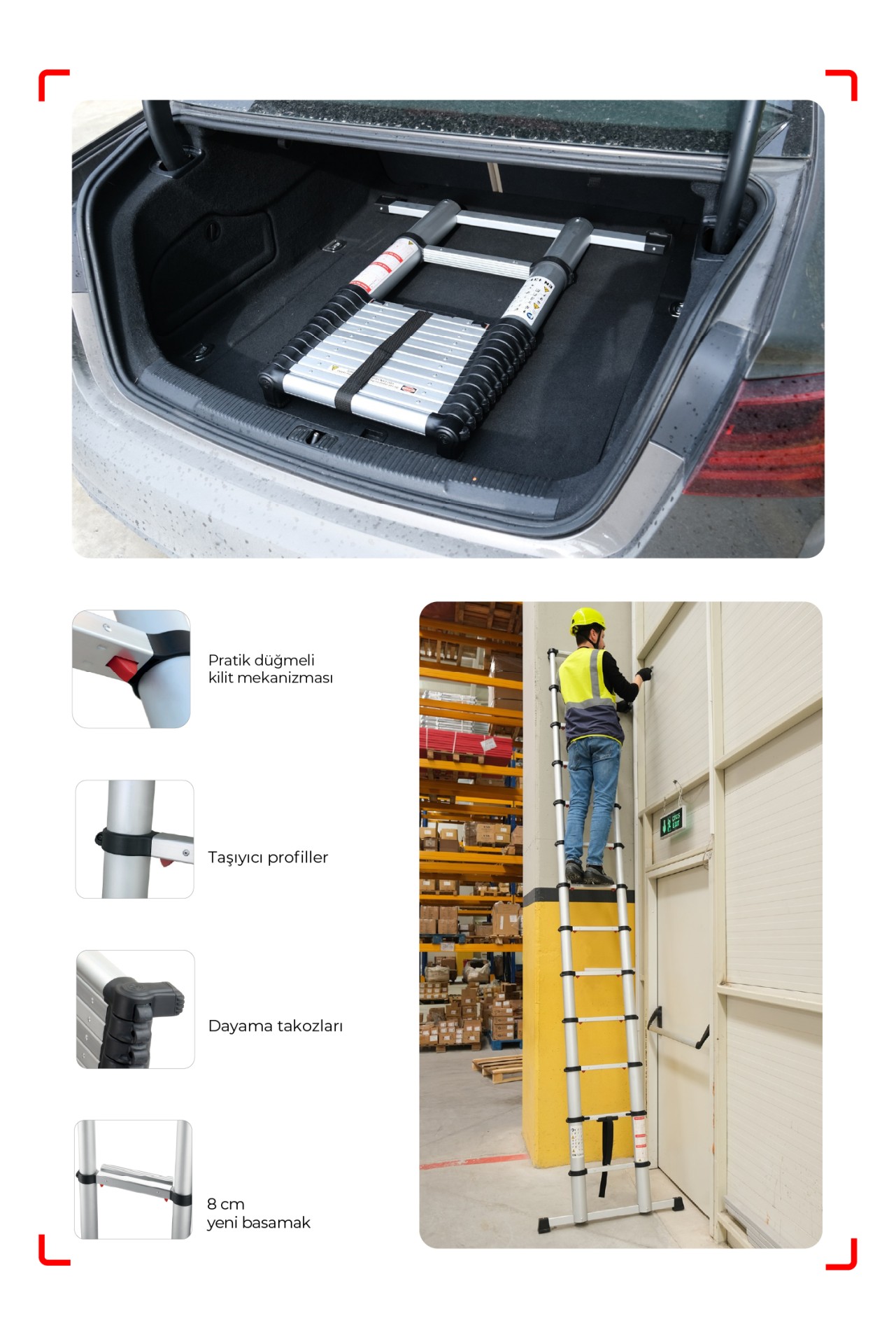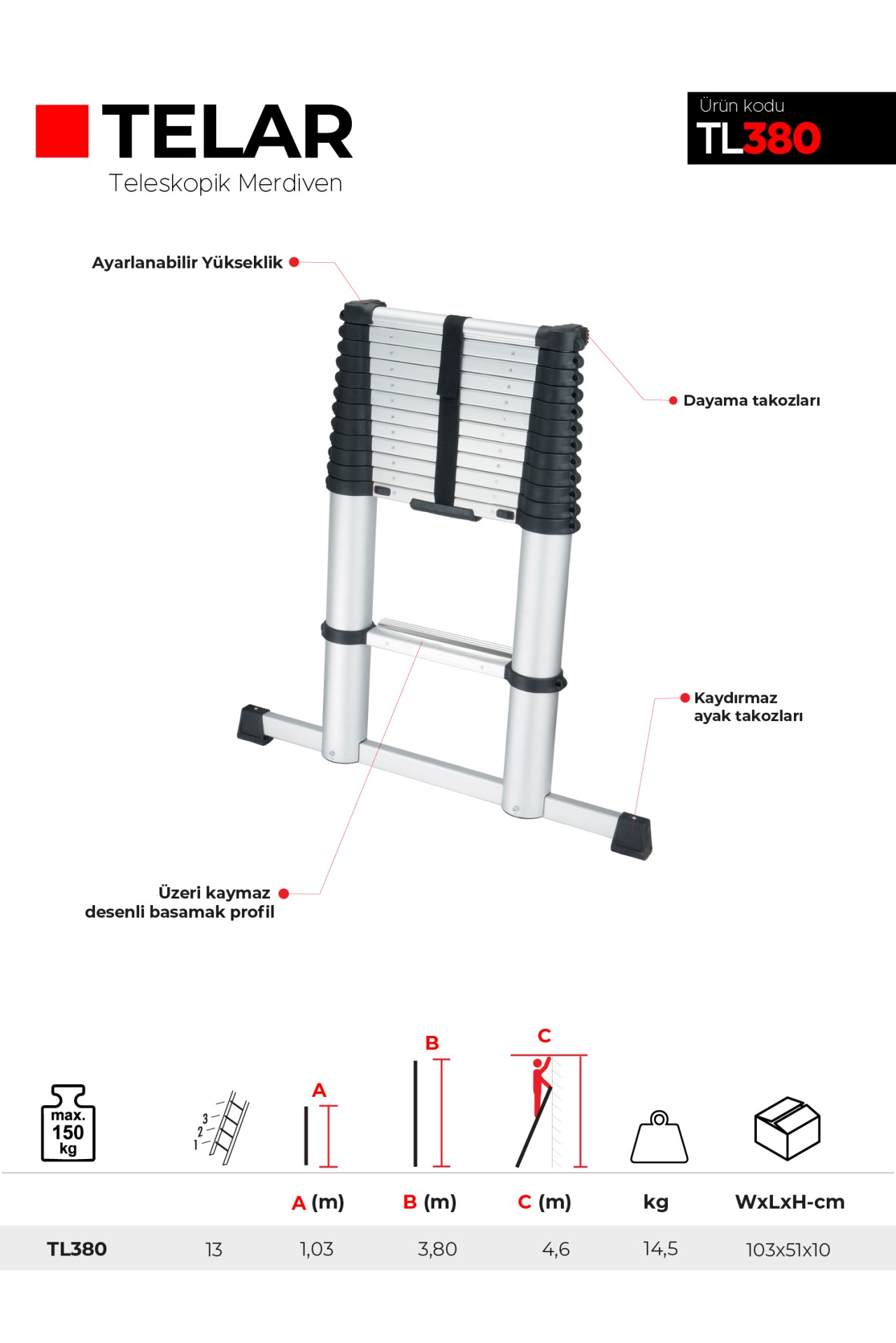 TELAR Teleskopik Merdivenler, tamirat, boya, bahçe işleri, ev işleri, temizlik faaliyetleri gibi birçok alanda kullanım için tasarlanmıştır. Uzunluğunun, katlanmış autosteps özelliği sayesinde her basamak yüksekliğince ayarlanabilir olması, dikey yüzeylerde 3,8 metreye kadar farklı yüksekliklere ayarlayabilmenizi ve rahatlıkla çalışabilmenizi sağlar. Teleskopik yapısıyla, kapalı haliyle minimum yer kaplar ve araçların bagajında kolayca taşınabilir.