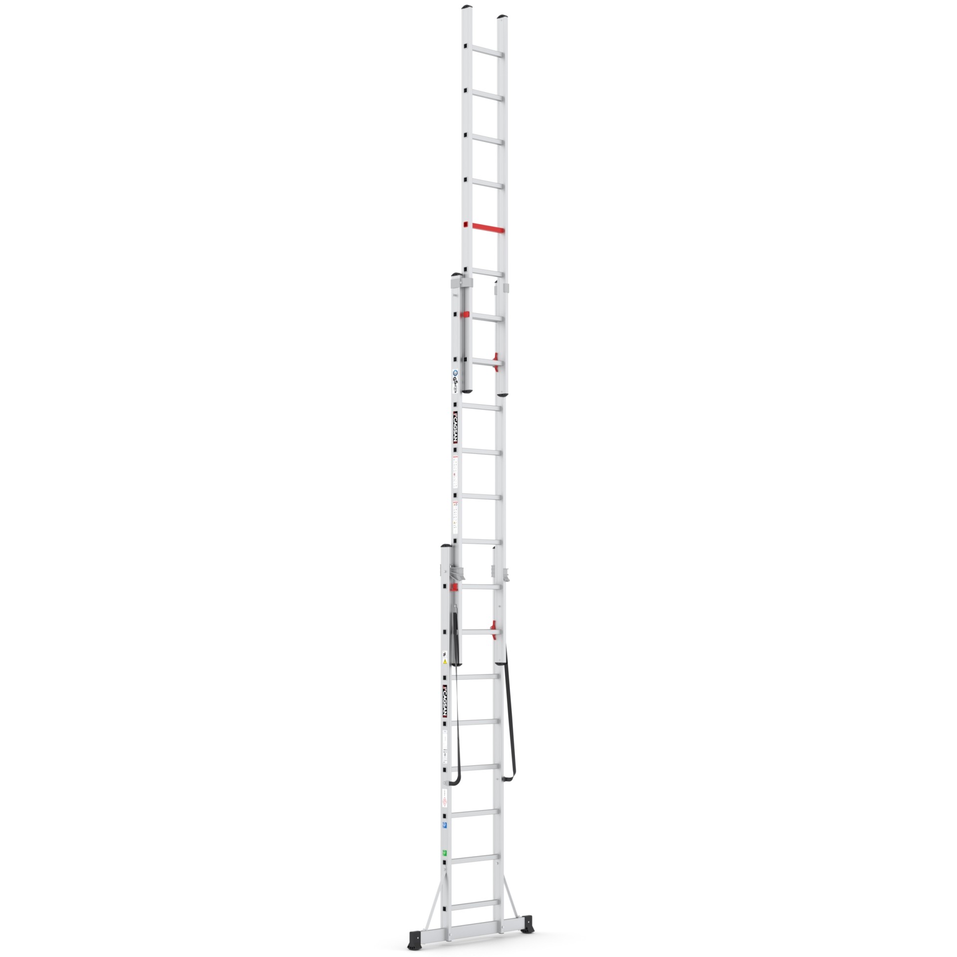 TRIOCOMBI - Üç Parçalı Çok Amaçlı Merdiven, inovasyon ve işlevselliğin mükemmel bir birleşimidir. Hem PTT tipi merdiven olarak duvara dayanabilir hem de A tipi kendinden destekli olarak kullanılabilir. Üstelik 3. parçasının yardımıyla yüksekliğini A konumunda daha da artırabilirsiniz. Pimli-kanallı u bağlantı profil sistemi sayesinde A konumdan kolayca sürgülü merdiven konumuna geçiş yapabilirsiniz.