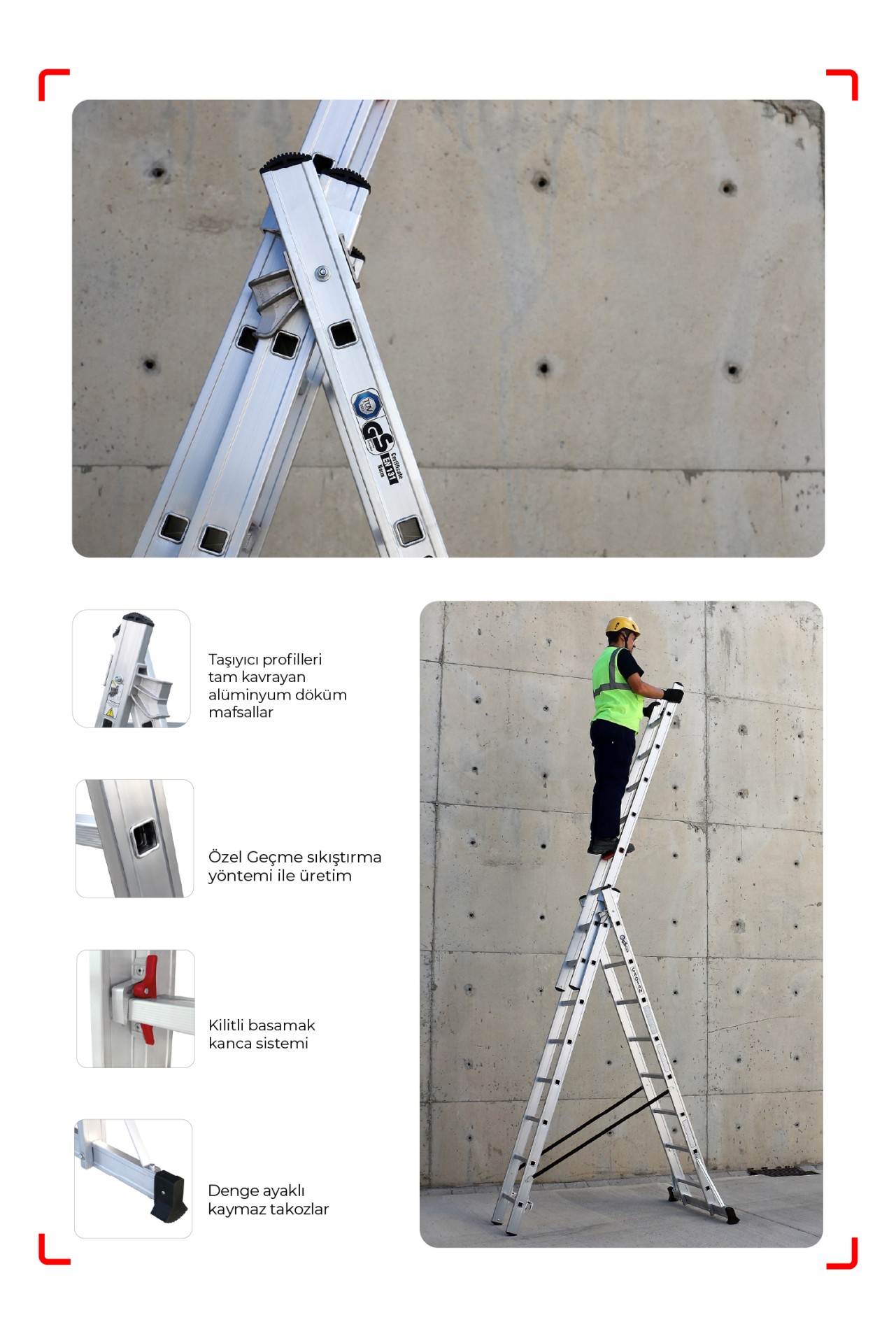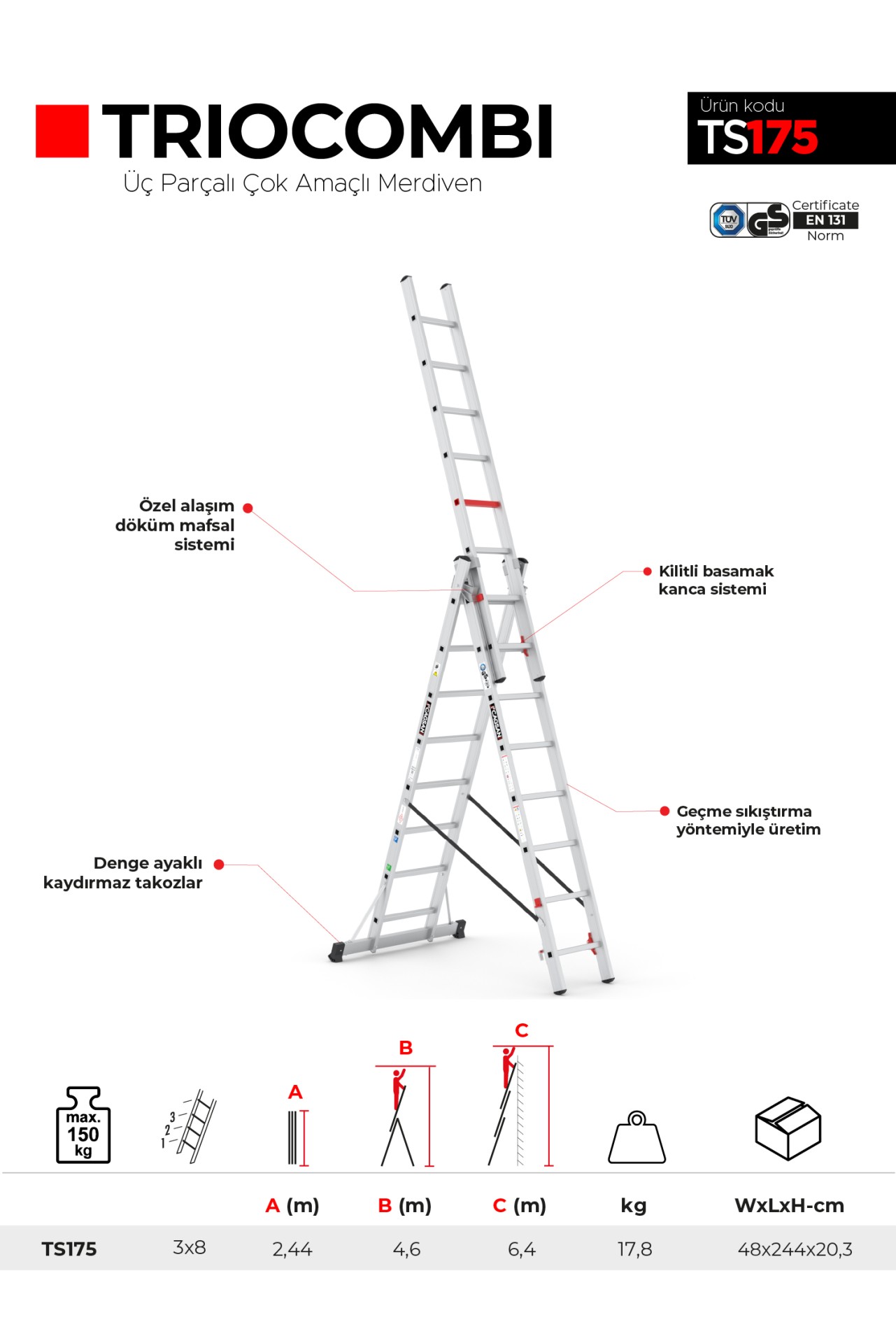 TRIOCOMBI, işinizde verimliliği artıran, taşıma kolaylığı sağlayan, güvenli ve dayanıklı bir seçenektir. İleri teknoloji ve kalite standartlarıyla donatılmış üç parçalı çok amaçlı bu merdiven, her profesyonelin ihtiyaçlarını karşılayacak şekilde tasarlanmıştır. Güvenle tercih edebilir, işlerinizi daha hızlı ve daha kolay hale getirebilirsiniz. Verimli ve güvenli çalışma ortamı için TRIOCOMBI'yi tercih edin!