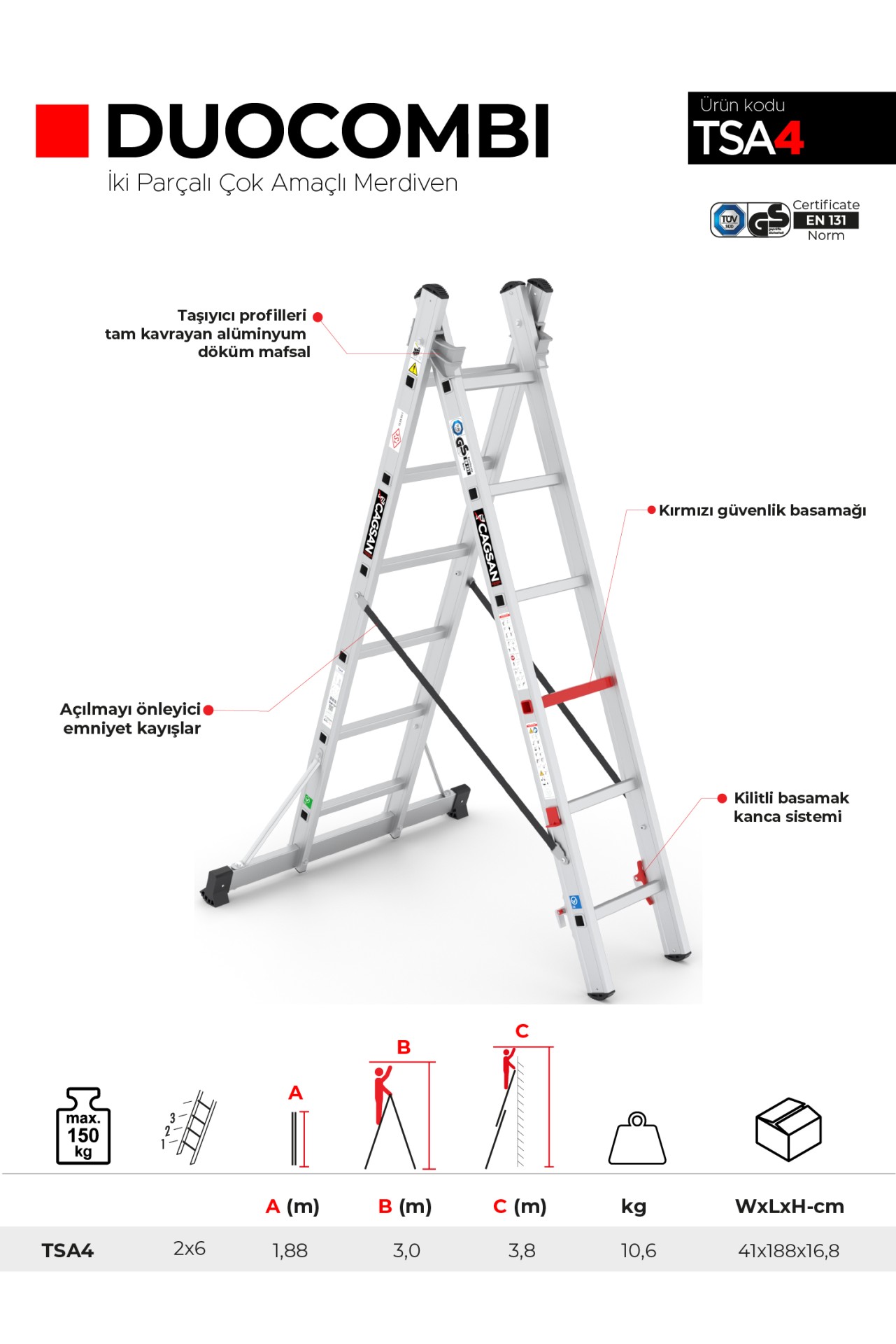 Çağsan DUOCOMBI merdivenlerin hafif yapısı, taşınmasının kolay olmasını sağlar ve çalışma alanlarında hareketlilik kazandırır. Aynı zamanda sağlamlığı ve yüksek taşıma kapasitesi sayesinde güvenlidir.