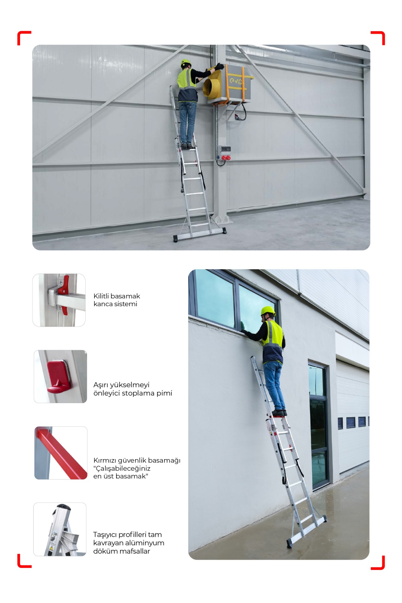 Yüksek kaliteli malzemelerden üretilen DUOCOMBI merdivenler, uzun ömürlü kullanım sunarken aynı zamanda ergonomik tasarımıyla da kullanıcı dostudur.