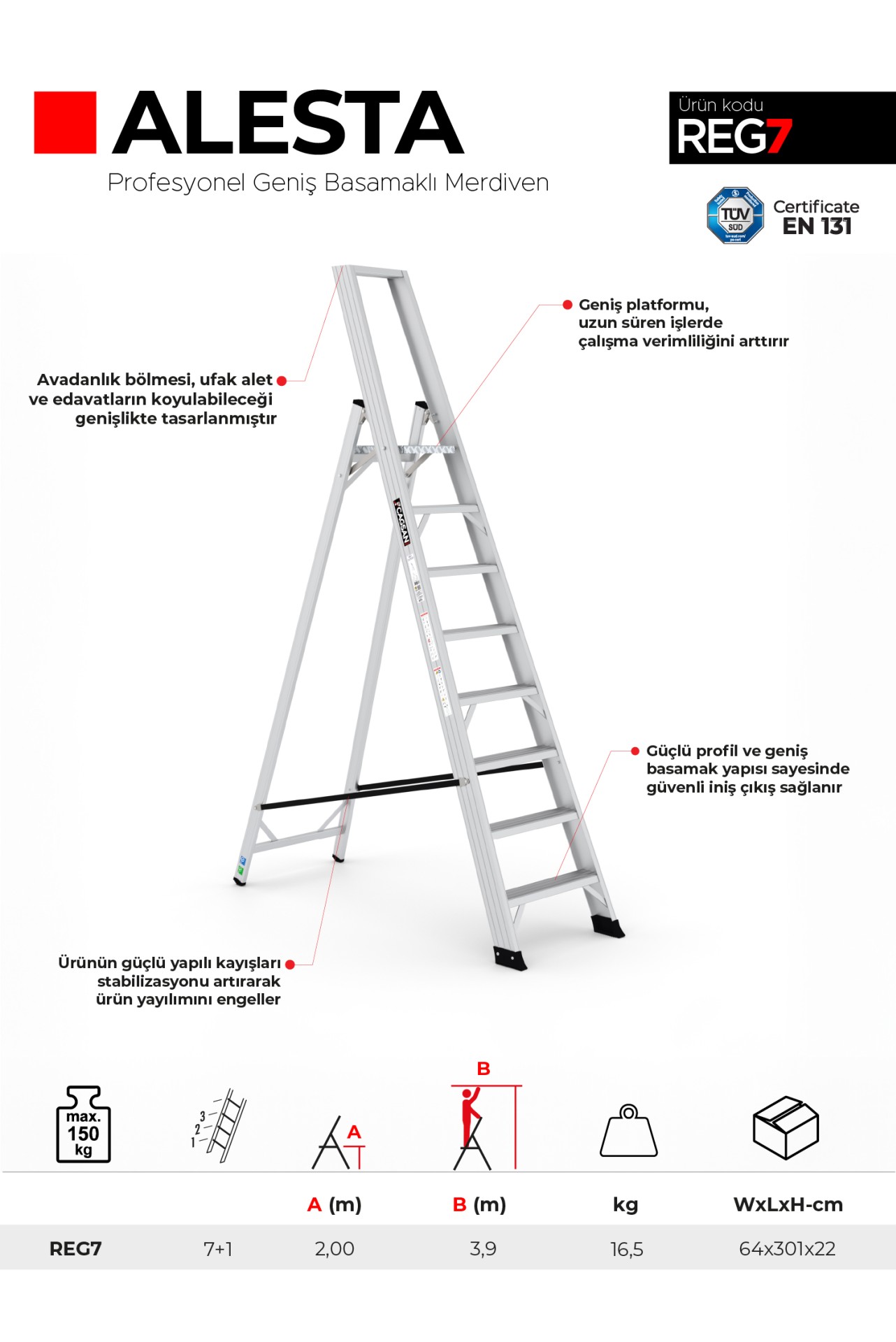 ALESTA, sağlam yapısı ve kullanışlı özellikleri ile öne çıkan profesyonel geniş basamaklı bir merdivendir. Alüminyum malzemeden imal edilmiş olması, hafiflik sağlar ve taşınabilirlik özelliği sunar. Ayrıca, basamakları geniş olduğu için ergonomik bir çalışma deneyimi yaşatır. Özel mafsalı sayesinde de kolaylıkla katlanıp açılabilir.