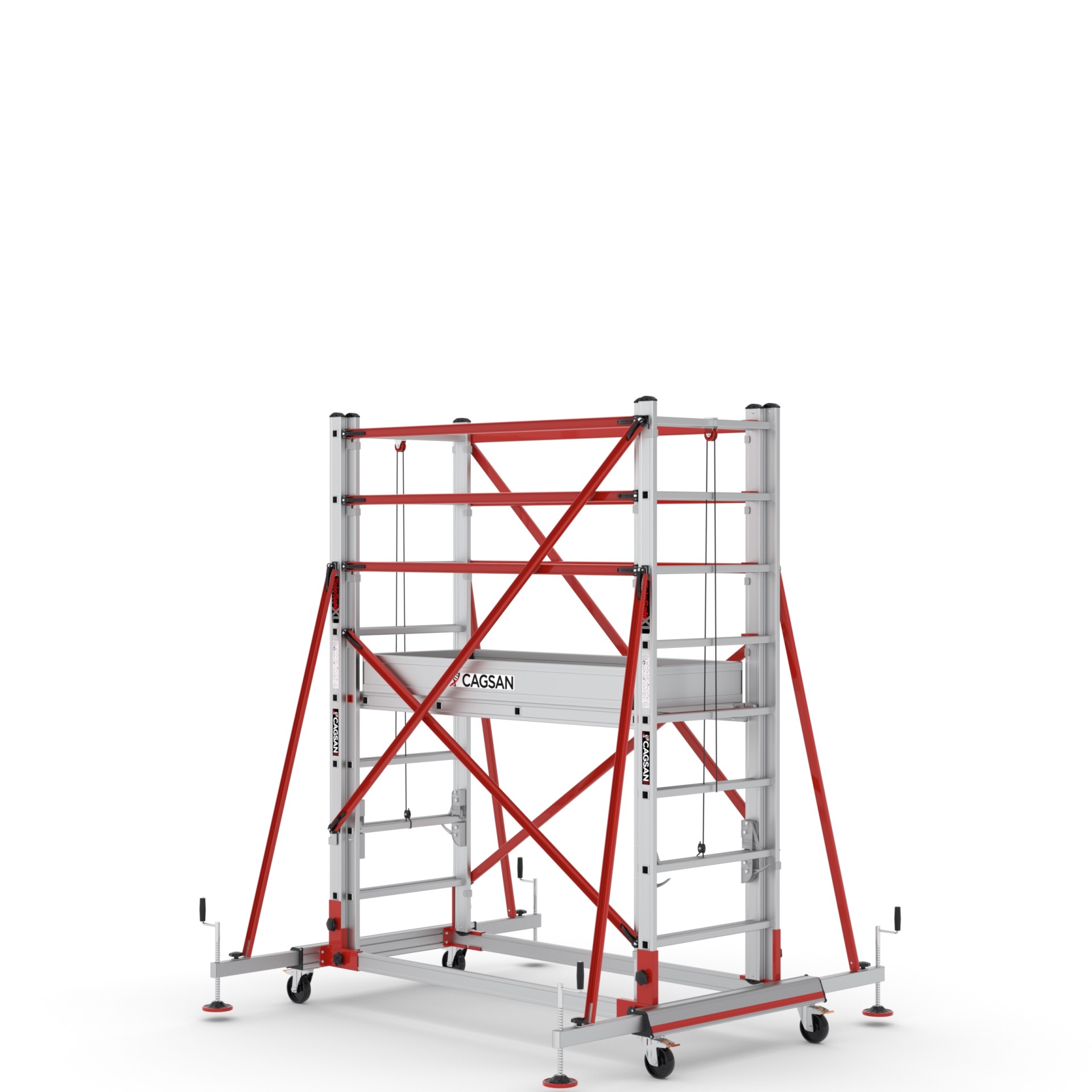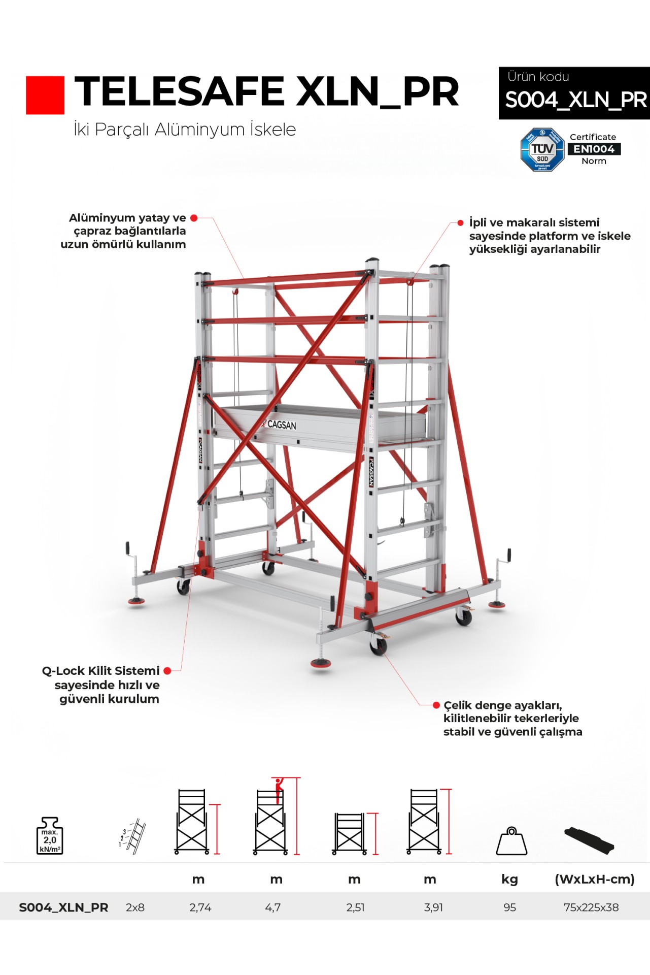 Q-Lock Kilit Sistemi sayesinde hızlı ve güvenli bir şekilde kurulum yapabilirsiniz. İpli ve makaralı sistemlerle platform ve iskele yükseklikleri her 28 cm'de bir ayarlanabilir. İçten açılan platform kapakları, personelin platforma güvenli bir şekilde ulaşmasını sağlar. 110 cm yüksekliğindeki korkuluklar, çalışanlara güvenli bir çalışma ortamı sunar.