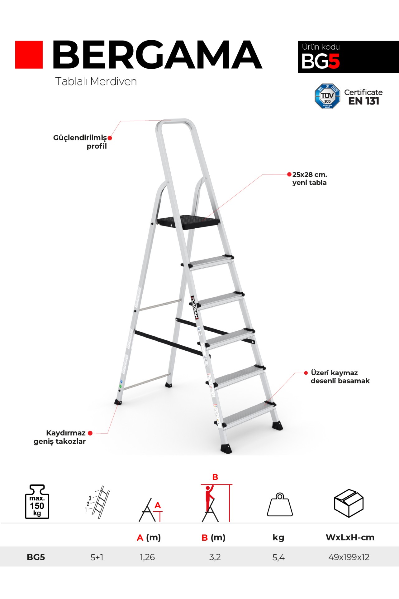 BERGAMA - Tablalı Merdivenler, ev, hobi ve ofis kullanımı için ideal bir seçenektir. 60 cm. tabla yüksekliğinden başlayarak 148 cm. tabla yüksekliğine kadar farklı modelleri bulunmaktadır. Merdivenlerimiz özel alaşım alüminyum malzemeden üretilmiştir, bu sayede hafif ve sağlam bir yapıya sahiptir. Hem taşıması kolaydır, hem de uzun ömürlü bir kullanım sunar. Güvenliğinizi ön planda tutarak tasarlanmıştır.