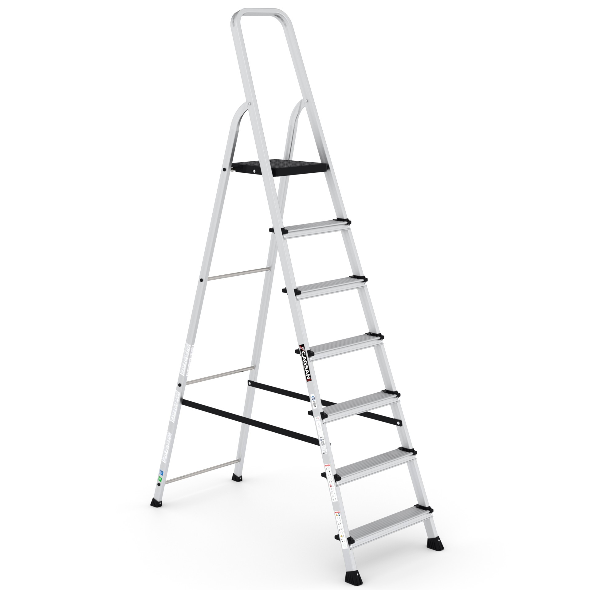 BERGAMA - Tablalı Merdivenler, ev, hobi ve ofis kullanımı için ideal bir seçenektir. 60 cm. tabla yüksekliğinden başlayarak 148 cm. tabla yüksekliğine kadar farklı modelleri bulunmaktadır. Merdivenlerimiz özel alaşım alüminyum malzemeden üretilmiştir, bu sayede hafif ve sağlam bir yapıya sahiptir. Hem taşıması kolaydır, hem de uzun ömürlü bir kullanım sunar. Güvenliğinizi ön planda tutarak tasarlanmıştır.
