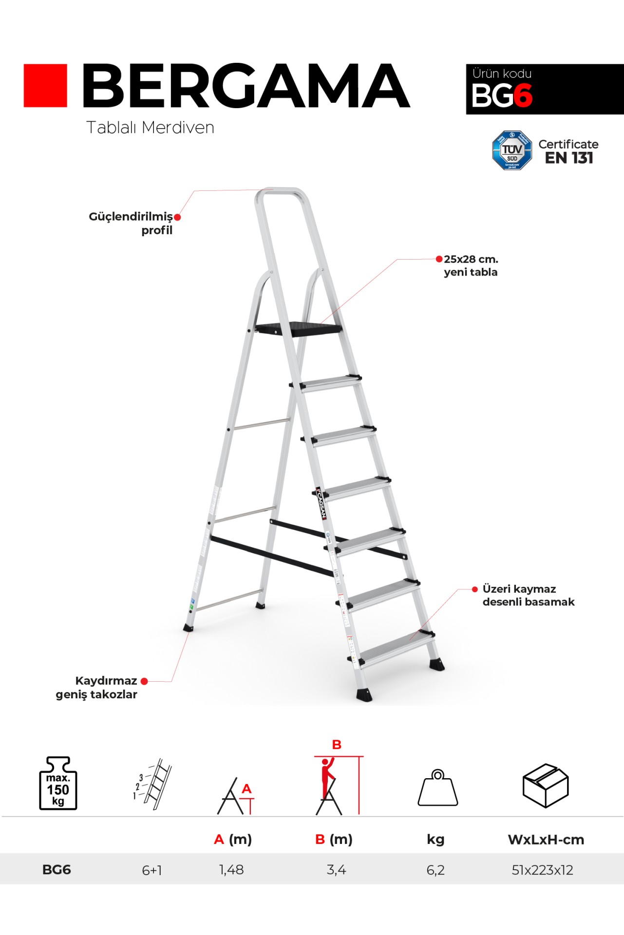 BERGAMA Tablalı Alüminyum Merdivenler, çeşitli tabla yükseklikleri, hafif ve sağlam yapı, TÜV-SÜD EN 131 kalite belgeleri, geniş basamaklar ve tabla, uzun ömürlü malzeme, güvenli ve ergonomik tasarım, çeşitli boy seçenekleri gibi avantajlarıyla evinizde, hobilerinizde ve ofisinizde güvenle kullanabileceğiniz bir üründür.