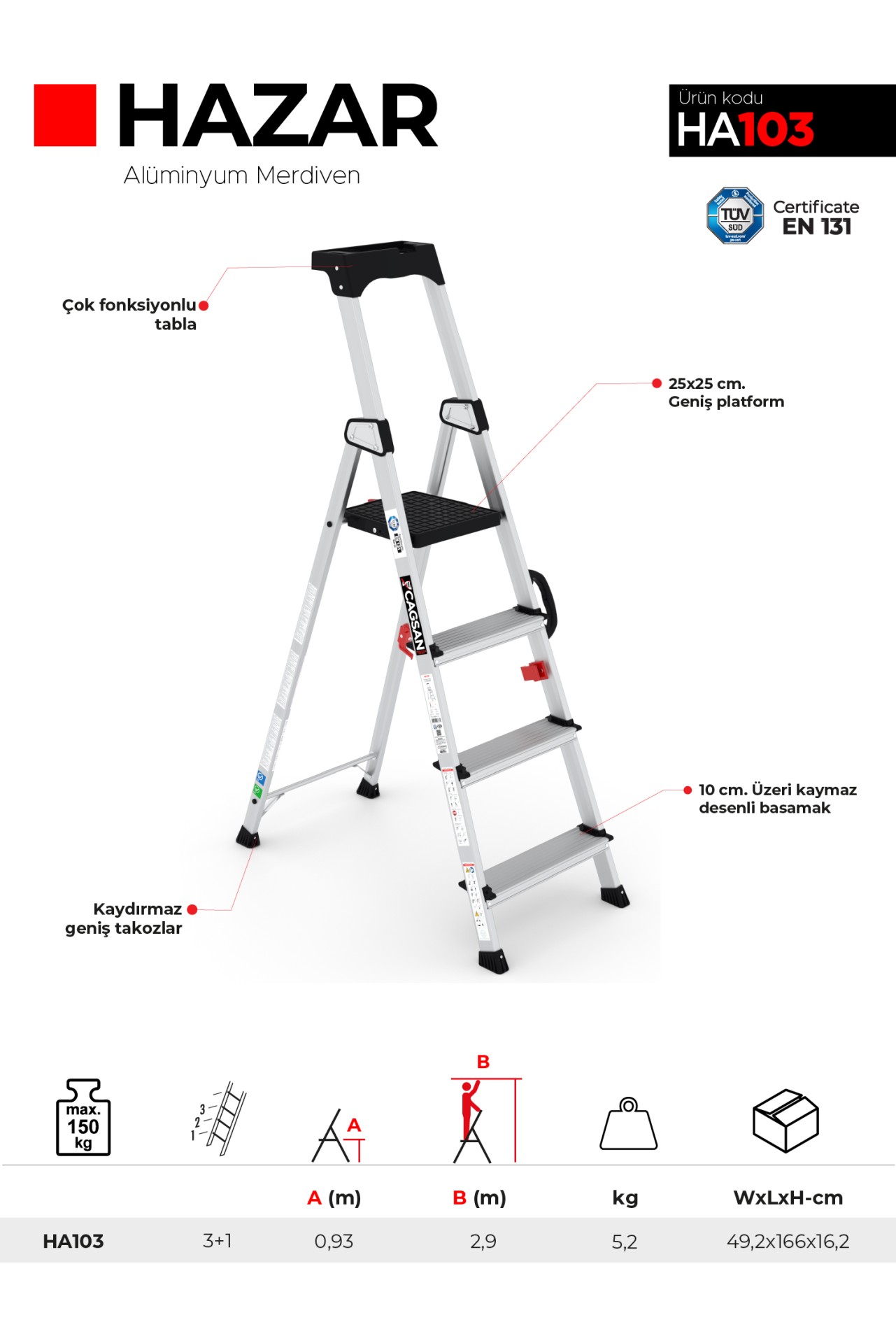 Çağsan 3+1 Basamaklı Hazar Alüminyum Merdiven (HA103)