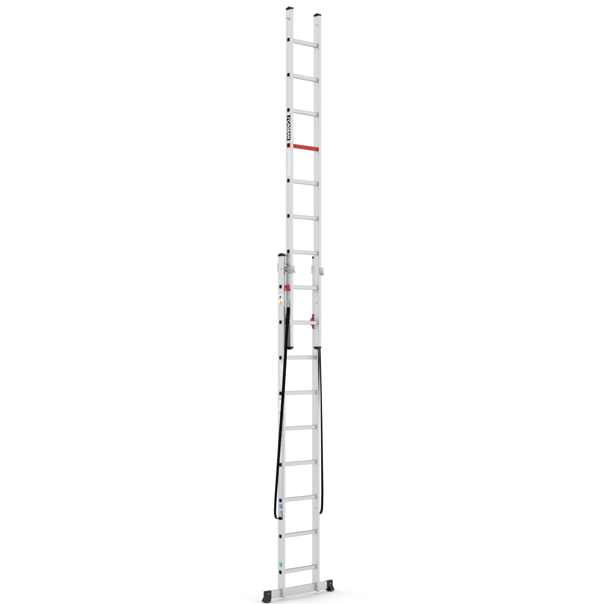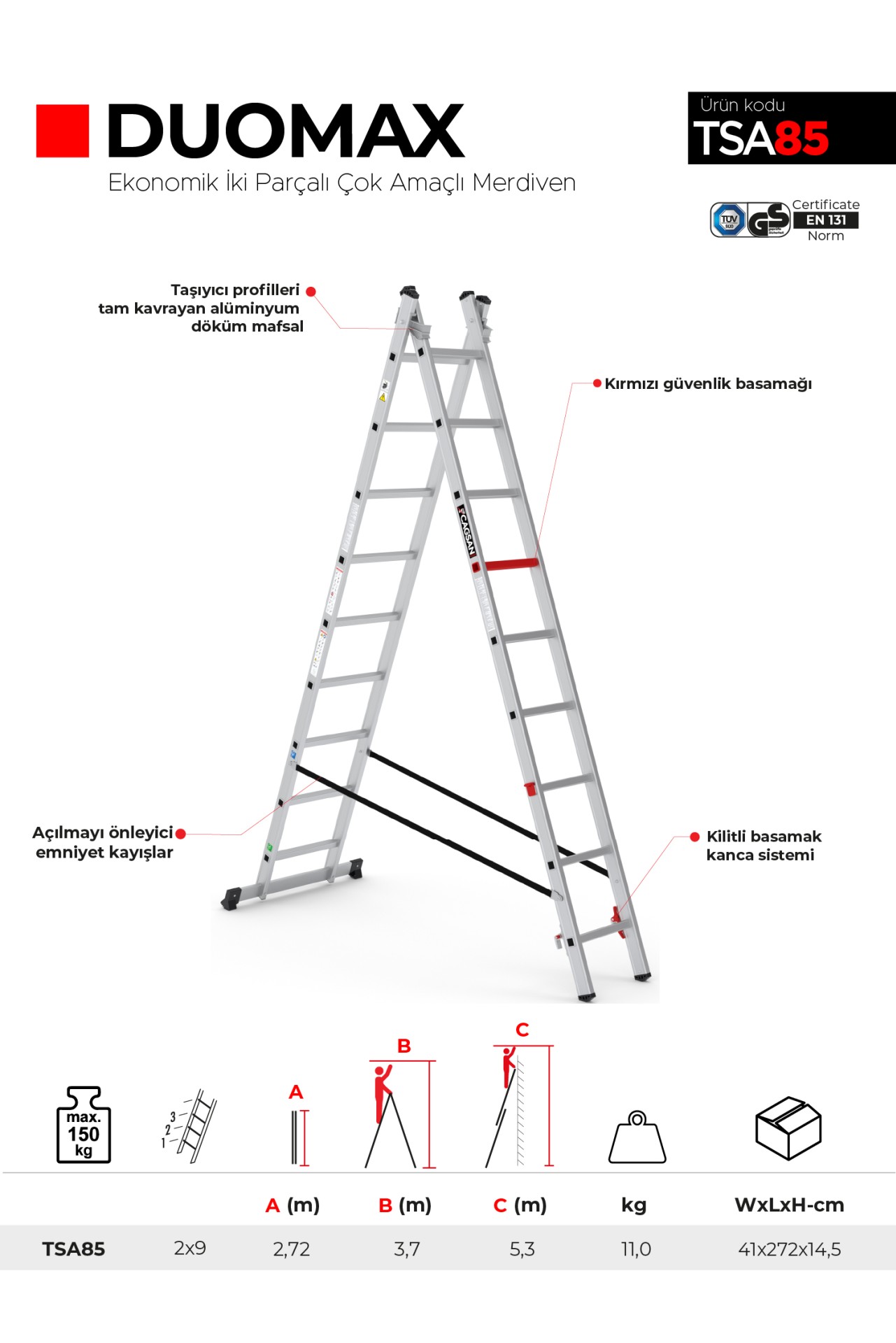 DUOMAX, güçlü performansıyla tanınan ve ekonomik bir seçenek sunan iki parçalı çok amaçlı merdivenlerdir. Tüm boyları 63 mm'lik özel profillerden üretilmiştir. İki farklı kullanım fonksiyonuna sahiptir ve hem duvara dayamalı olarak hem de A tipi açılır şekilde hiçbir yere dayamadan kullanılabilir.